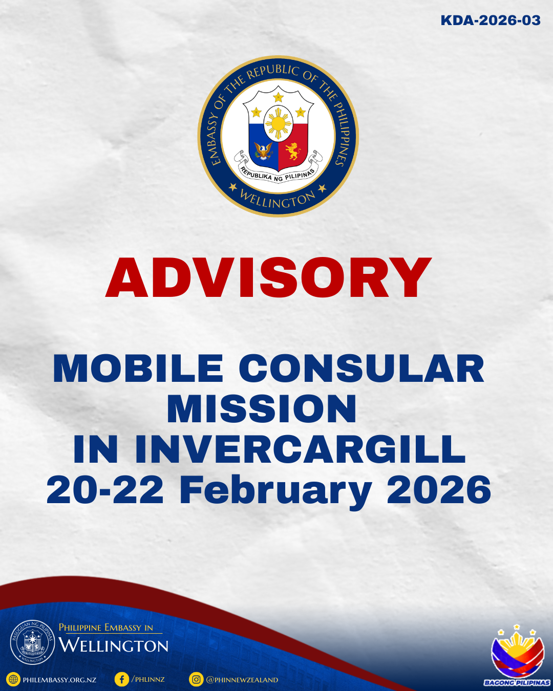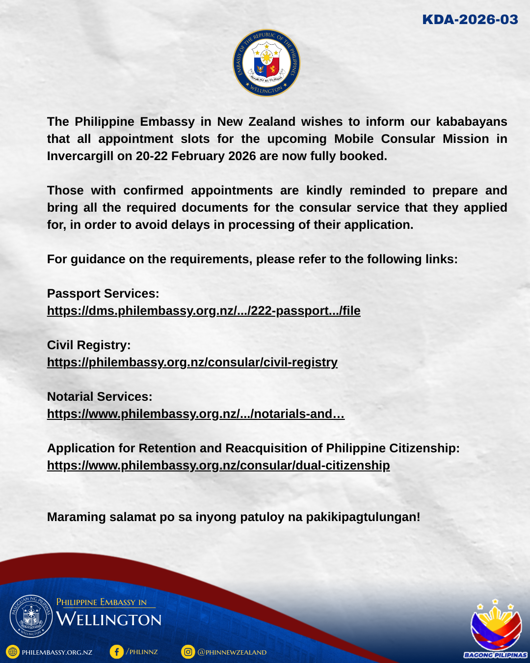 The Philippine Embassy in New Zealand wishes to inform our kababayans that all appointment slots for the upcoming Mobile Consular Mission in Invercargill on 20-22 February 2026 are now fully booked.