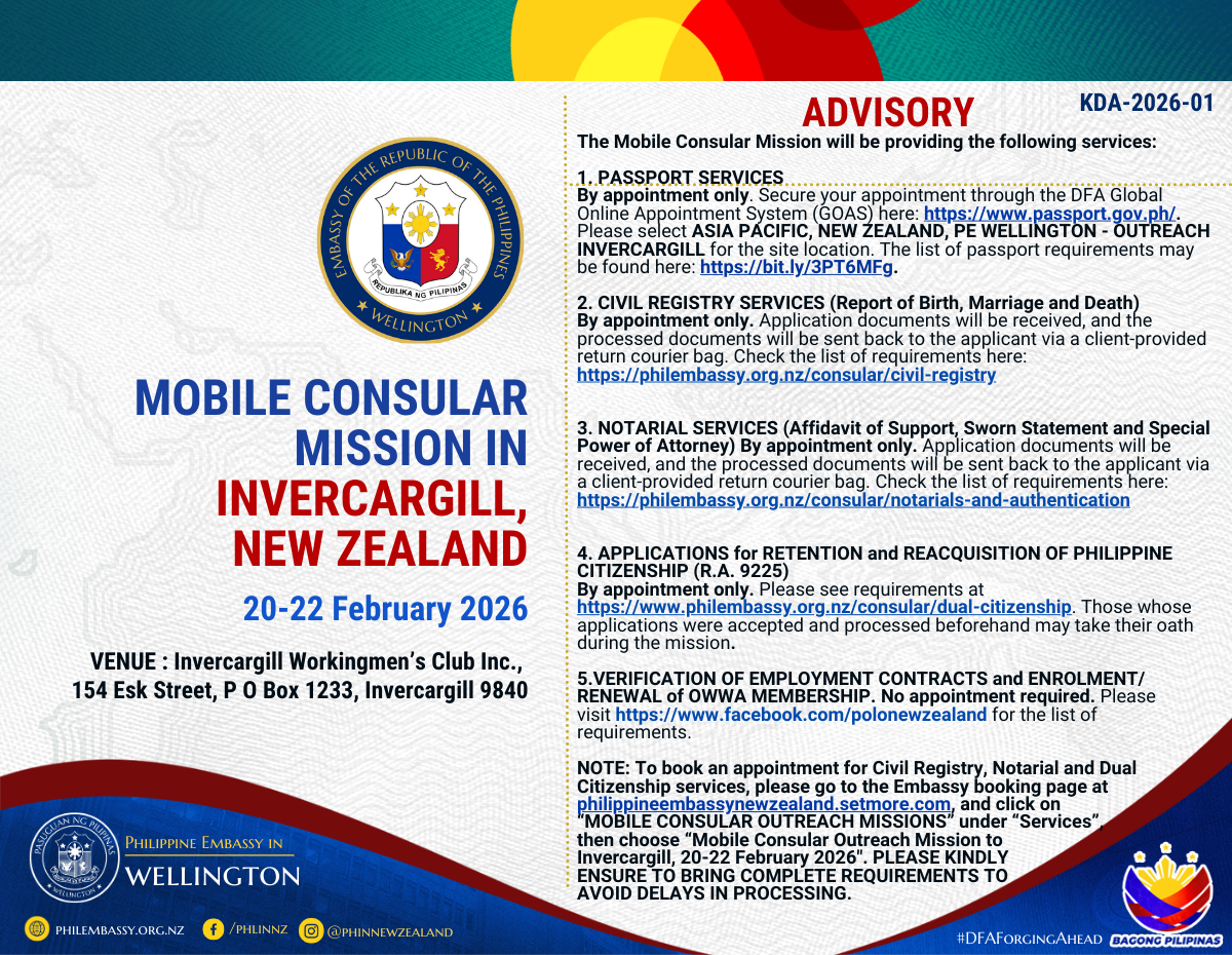 NOTE: To book an appointment for Civil Registry, Notarial and Dual Citizenship services, please go to the Embassy booking page at philippineembassynewzealand.setmore.com, and click on “MOBILE CONSULAR OUTREACH MISSIONS” under “Services”, then choose “Mobile Consular Outreach Mission to Invercargill, 20-22 February 2026".