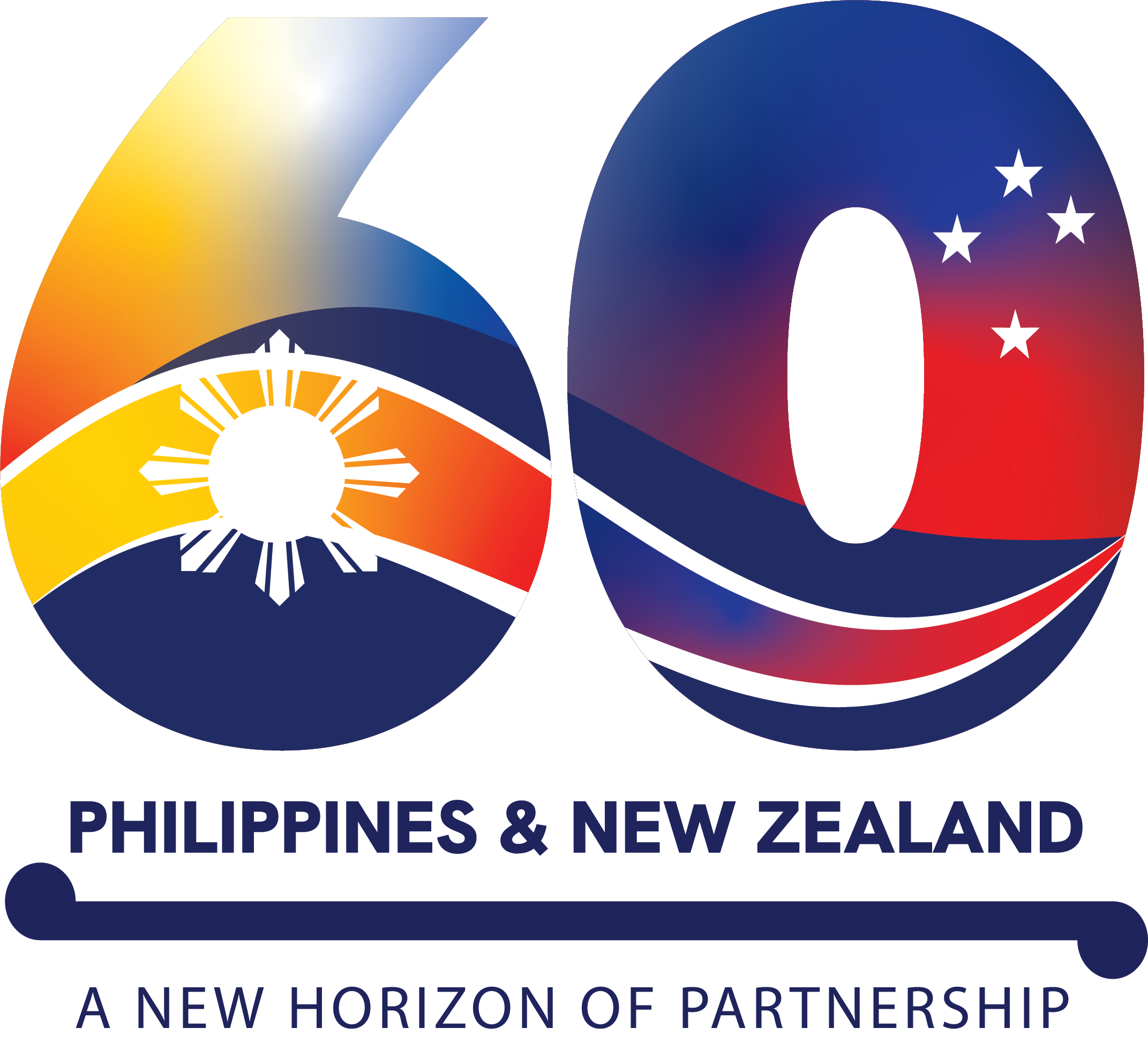 The logo features a stylized figure "60," incorporating the vibrant flag colors of both countries. The design prominently integrates wave and ocean motifs, symbolizing the maritime nature of the Philippines and New Zealand, their deep connection to the sea, and their shared heritage as nations shaped by ocean-going ancestors. These elements also reflect the countries' common interests within the wider Indo-Pacific region.